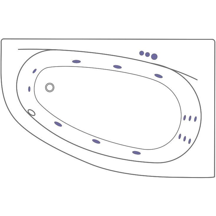 Ванна имеет размеры 170х110 см, что позволяет разместить её в углу вашей ванной комнаты. Объем ее чаши составляет 235 литров. Встроенная система гидромассажа включает в себя боковой массаж, массаж спины и стоп. Управление осуществляется механической системой с пневматической кнопкой для простоты использования. В комплект входят каркас и комплект креплений, а слив-перелив с диаметром 5.2 см расположен по центру. Подголовник приобретается отдельно, как и экран к ванне.