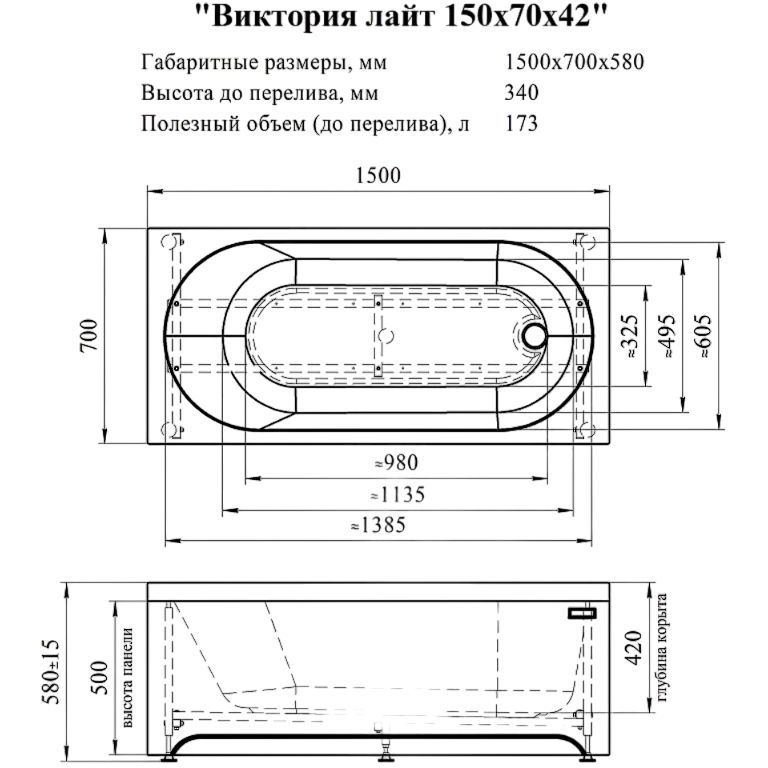 Данная модель акриловой ванны имеет габариты 150x70 см и вмещает до 173 литров воды, что позволяет наслаждаться комфортным купанием. Каркас обеспечивает дополнительную устойчивость и долговечность конструкции. Диаметр сливного отверстия составляет 5 см, обратите внимание, что слив-перелив приобретается отдельно. Ванна усилена внешним армирующим слоем, что придаёт дополнительную прочность.