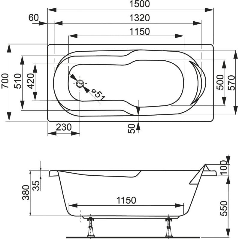 - Габариты ванны составляют 150x70 см, что позволяет ей легко вписаться в любую планировку;