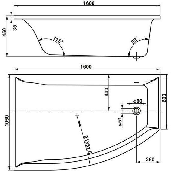 - Размеры: 160x105 см, угловая, асимметричная.