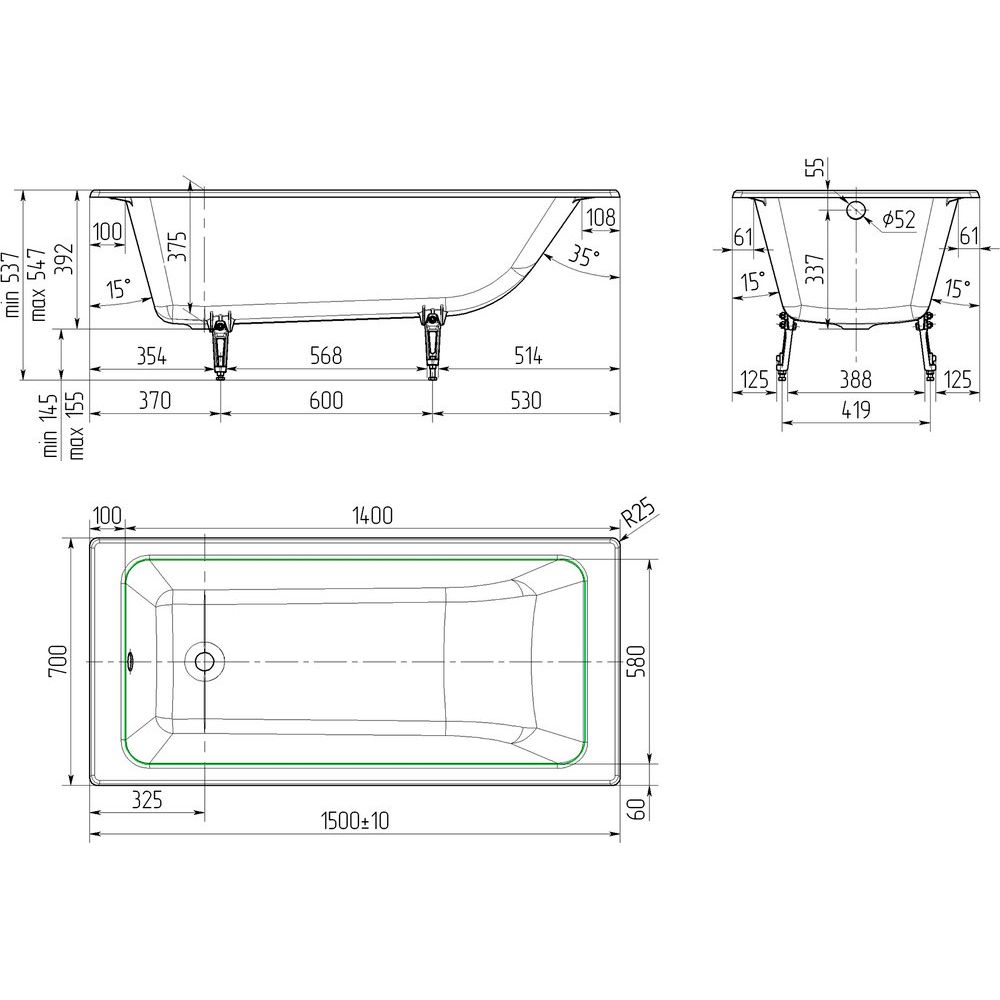 Чугунная ванна Универсал Оптима имеет габариты 150x70 см и объем 137 литров, что позволяет эффективно использовать пространство ванной комнаты. Она выполнена с классическим расположением слива-перелива диаметром 5.2 см, однако слив-перелив необходимо приобретать отдельно. В комплект входит регулируемый по высоте комплект ножек, которые позволяют установить ванну на удобной для вас высоте. Гарантия на ванну составляет 18 месяцев, а на ножки — 25 лет, что является отличным показателем надежности продукции.