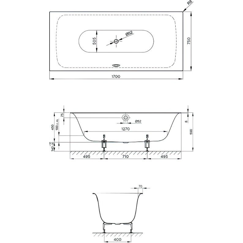 Это встраиваемая стальная ванна размером 170x75 см и объемом 156 литров. Центральное расположение отверстия перелива способствует элегантности дизайна. Ванна обладает уникальной шумоизоляцией и самоочищающимся покрытием. Для организации слива-перелива необходимо приобрести дополнительный комплект, с диаметром сливного отверстия 5.2 см. К ванне прилагаются металлические ножки Bette B23-1500. Основная часть продукции сопровождается 30-летней гарантией, а ножки — 2-летней, что подчеркивает надежность материалов.