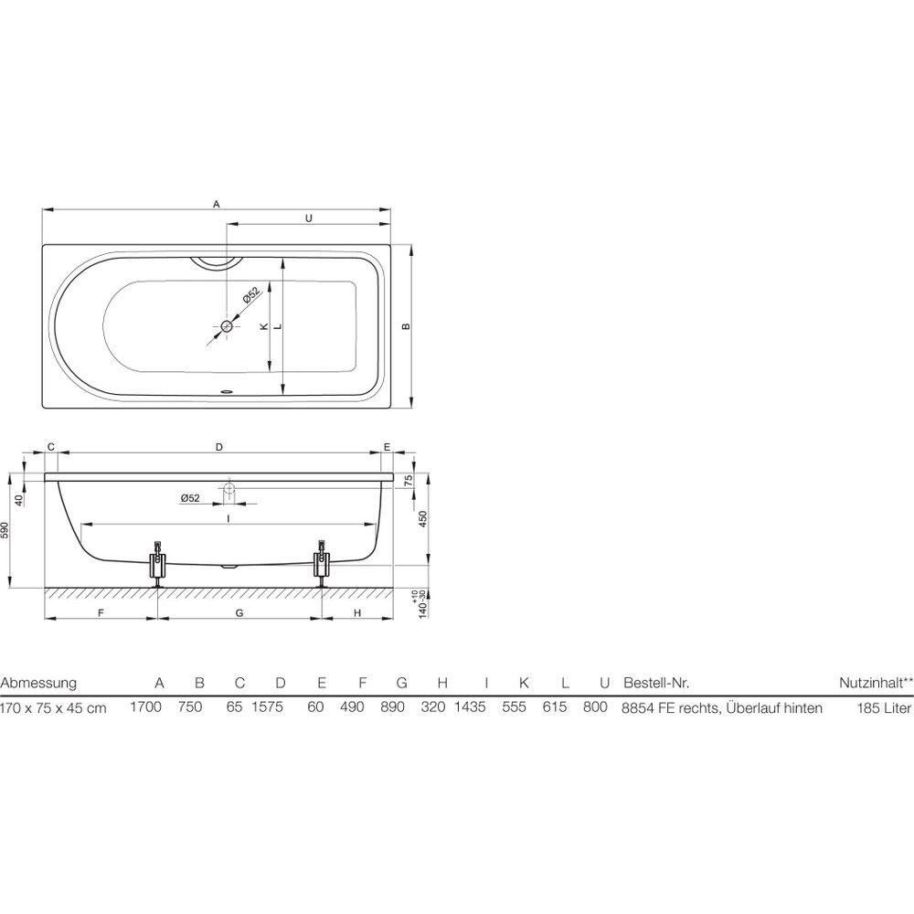 Основой этой ванны является стальная чаша Bette Ocean 8854-000, выполненная в размерах 170x75 см, которые идеально подходят для установки в стандартную ванную комнату. Особенность этой модели — центральное расположение отверстия перелива для удобства использования, а также стандартный диаметр сливного отверстия 5.2 см. В комплект входят металлические ножки Bette B23-1500, обеспечивающие надежную опору и высокую устойчивость, с гарантией на 2 года.